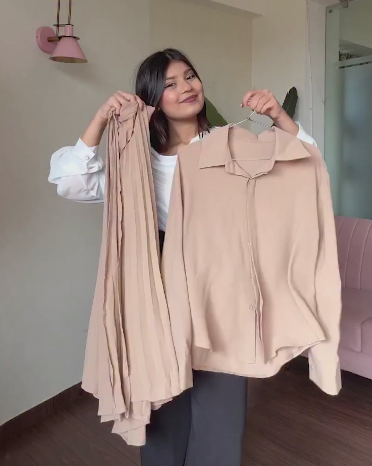 This elegant 2-piece set features a tailored button-up shirt paired with a pleated wrap skirt, combining classic structure with modern sophistication for a polished look. Fits XS-M easily.