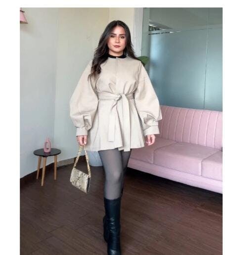 Structured mini trench coat with voluminous balloon sleeves and flared cut. Features a clip-up mechanism and matching belt for versatile styling. A refined layering essential that works across multiple occasions.